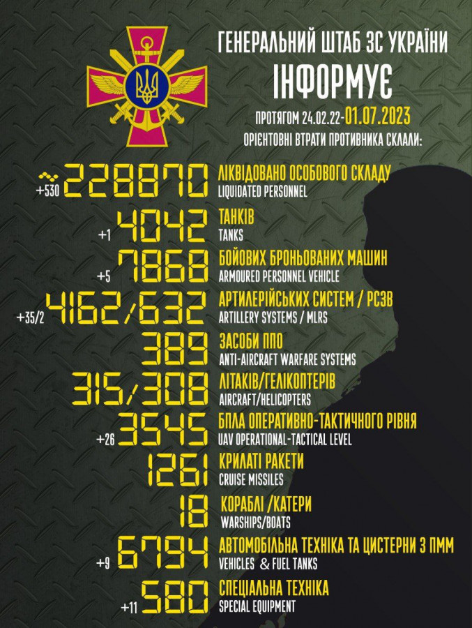 Загальні бойові втрати противника з 24.02.22 по 01.07.23 орієнтовно склали: