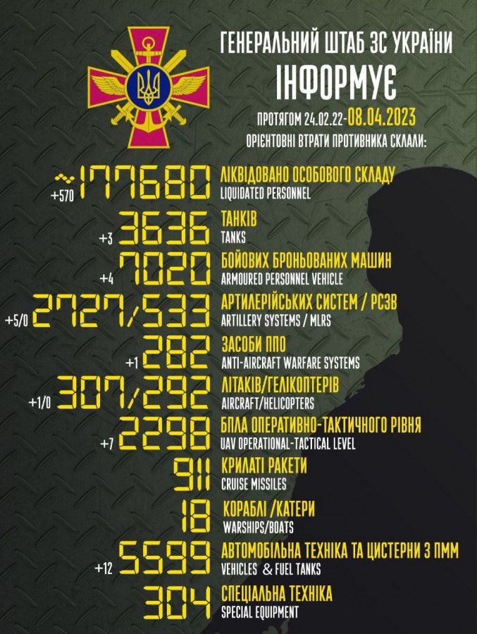Загальні бойові втрати противника з 24.02.22 по 08.04.23 орієнтовно склали: