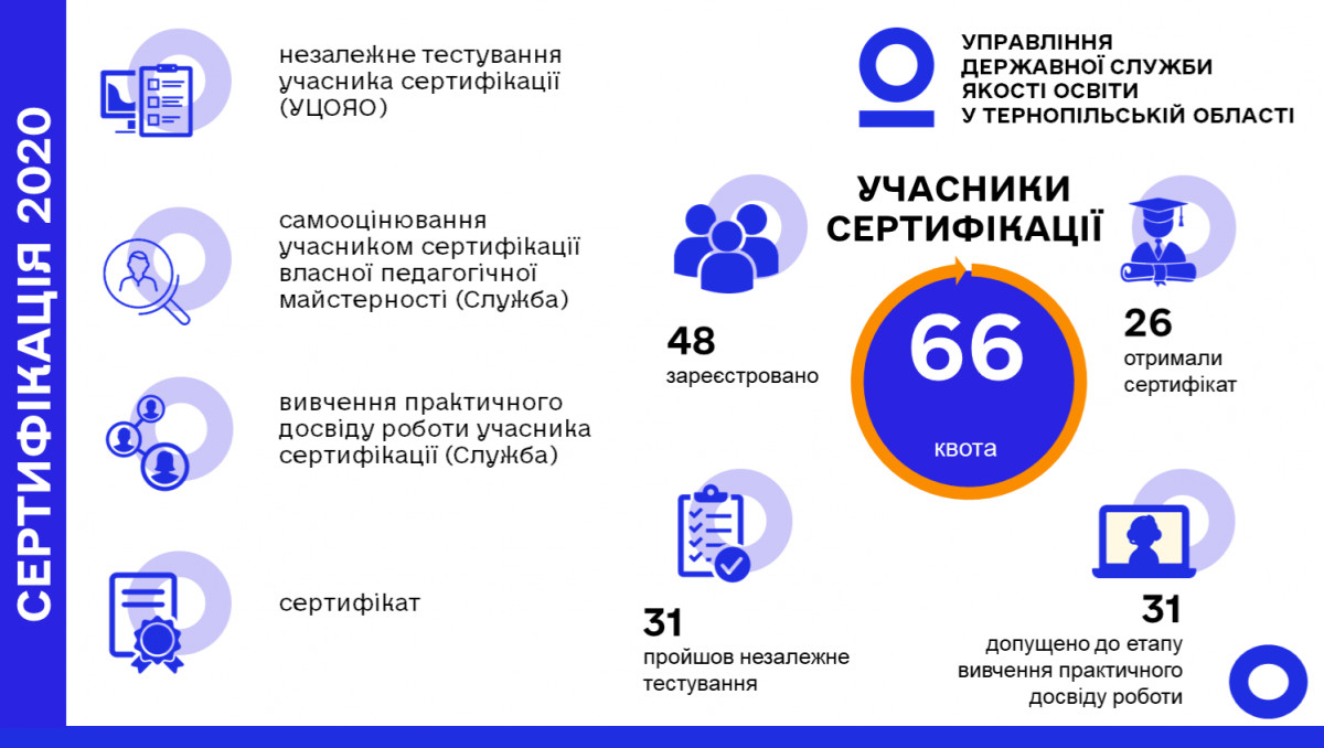 Цьогоріч участь у сертифікації зможуть взяти не більше 2000 педагогів. Відповідно до наказу Міністерства освіти і науки України визначено граничну кількість вчителів для проходження сертифікації в розрізі регіонів, зокрема для Тернопільської області – 65 осіб.