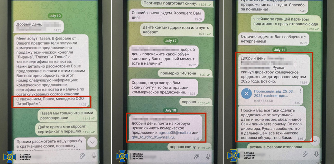 Дослівно служба: "У межах досудового розслідування слідчі СБУ також зафіксували листування батька посадовця НАБУ з представником однієї з агрокомпаній Дагестану (РФ) щодо продажу технічної коноплі. Відповідну інформацію знайдено у телефоні підозрюваного. Зокрема, у цій комунікації представник російської компанії повідомляє, що отримав комерційну пропозицію та просить якнайшвидше надіслати актуальні сертифікати якості на продукцію. Він пояснює, що документи потрібні терміново, оскільки добігає кінця дія державної програми РФ з відшкодування витрат на вирощування технічних конопель".