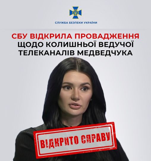 Служба безпеки України відкрила кримінальне провадження стосовно колишньої ведучої телеканалів підозрюваного у держзраді колишнього народного депутата Віктора Медведчука.