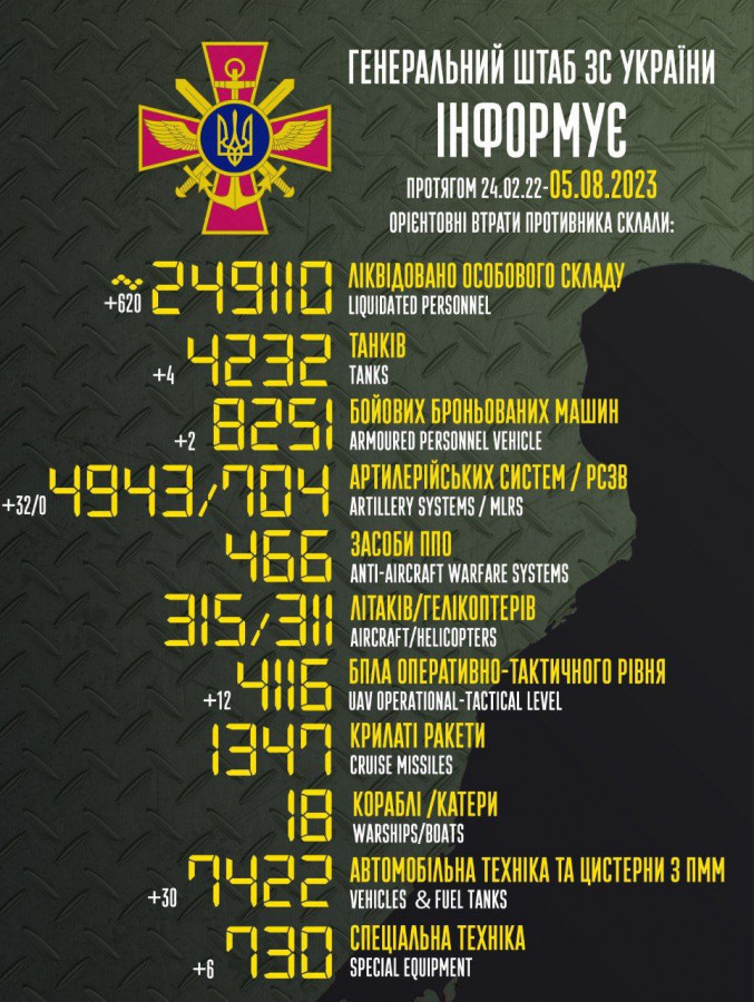 Загальні бойові втрати противника з 24.02.22 по 05.08.23 орієнтовно склали: