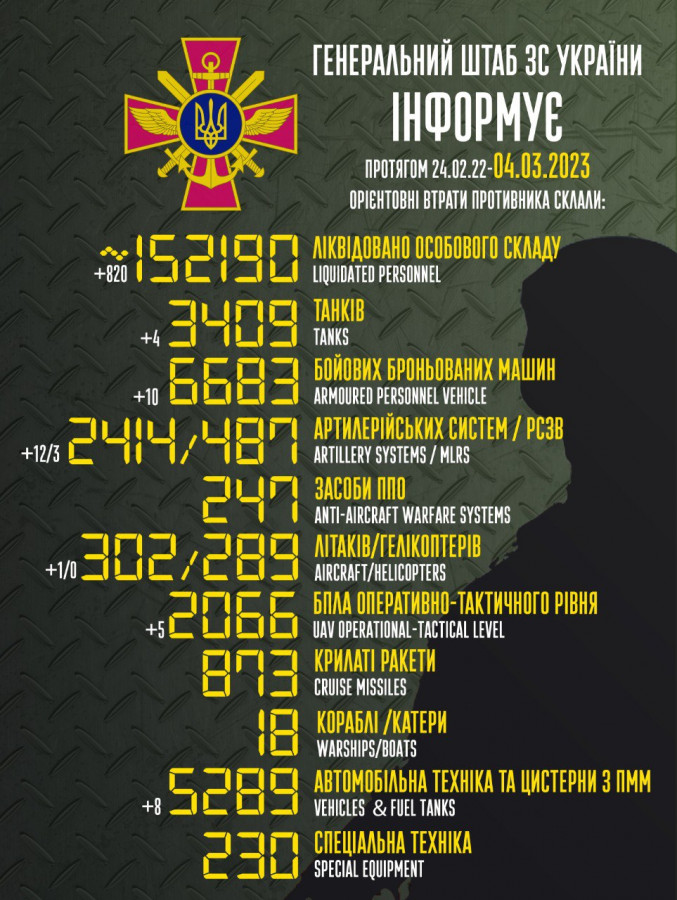 Загальні бойові втрати противника з 24.02.22 по 04.03.23 орієнтовно склали: