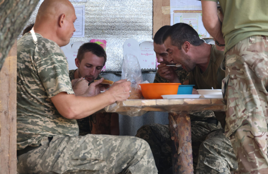 На позиції 57-ї мотопіхотної бригади імені кошового отамана Костя Гордієнка на обід – суп із м’ясом, бутерброди, сирно-м’ясна нарізка, огірки. Тут кажуть, що готують суворо за “розкладкою”, як у ППД (тобто на основі запитаних і надісланих обсягів продуктів).