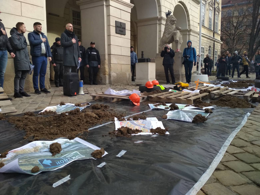 У цей час біля Ратуші протестують кілька груп. Зокрема, стоматологи, яким міська рада не дала гроші на зарплату, та активісти, що вимагають від міського голови Андрія Садового припинити нещадно забудовувати Львів, привезли під Ратушу землі. А також прийшли ті, хто обурений, що в місті розбиті дороги.