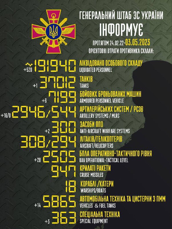 Повідомляється, що загальні бойові втрати противника з 24 лютого орієнтовно склали 191 940 осіб ліквідованими.