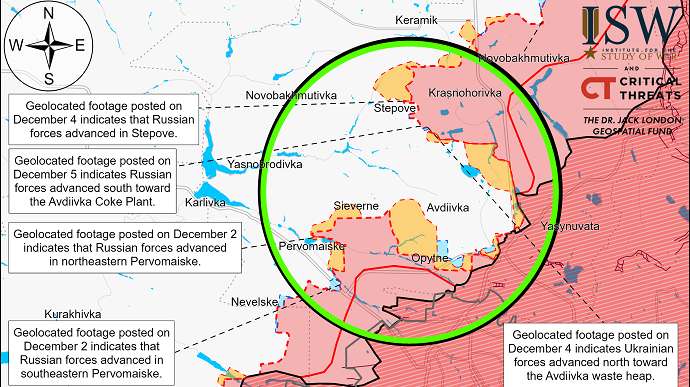 Російські військові блогери стверджують, що 4 і 5 грудня російські війська просунулися вперед в районі Новокалинового (8 км на північ від Авдіївки), Степового, Авдіївського коксохімічного заводу, Авдіївського терикону, промзони на південний схід від Авдіївки, Сєверного і Первомайського.