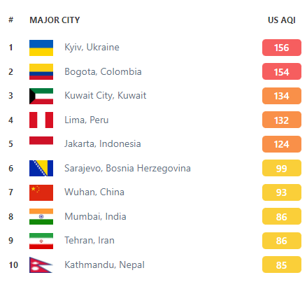 Згідно з сервісом QiAir, показник забрудненості повітря у Києві в обід, 5 вересня, складає 156, на другому місці розташувалася столиця Колумбії Богота (154), а на третьому – Кувейт (134).
