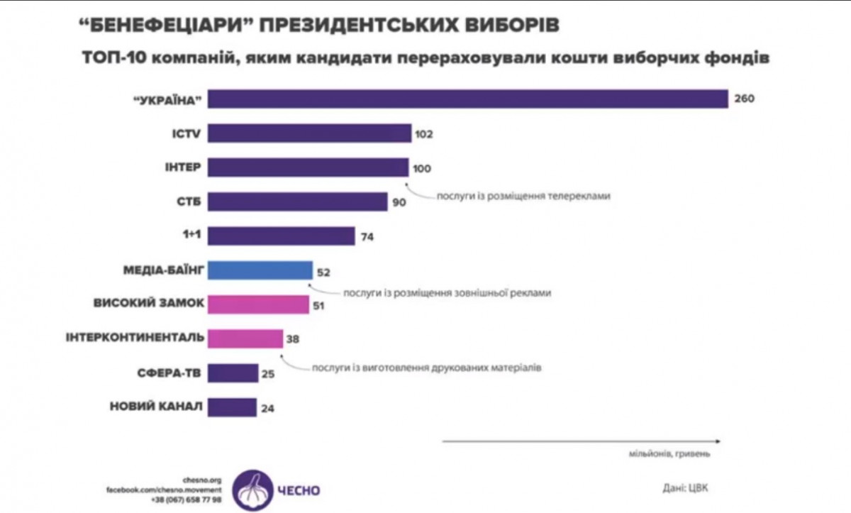 "Найбільше отримав телеканал "Україна", на якому вартість реклами є найбільшою і на якому досить активно замовляють (рекламу - ред.) політики, цей телеканал має високі рейтинги. Телеканал "Україна" отримав 260 мільйонів гривень - і це 23% від витрат усіх фондів кандидатів, це відчутна частка, п'ята частина витрат", - зазначила аналітик.
