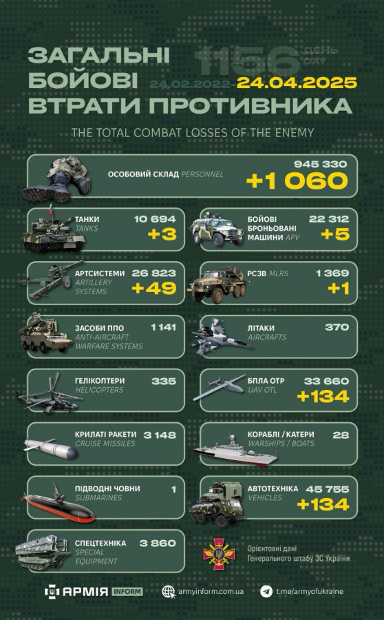Станом на ранок 24 квітня Збройні Сили України завдали суттєвих втрат російським окупаційним військам. За минулу добу ворог втратив ще 1 060 осіб — загиблими та пораненими.