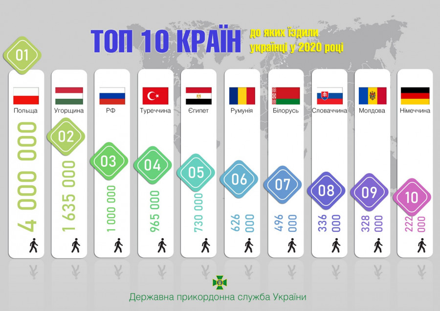 Минулого року наші співвітчизники здійснили подорож до 123 країн світу. Всього за кордон, навіть зважаючи на карантинні обмеження, змогли потрапити понад 11 млн 250 тис. громадян України.