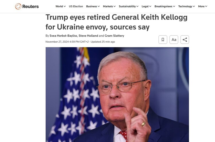 Дональд Трамп, обраний президент США, розглядає кандидатуру відставного генерал-лейтенанта Кіта Келлогга на посаду спецпосланця з врегулювання конфлікту в Україні.