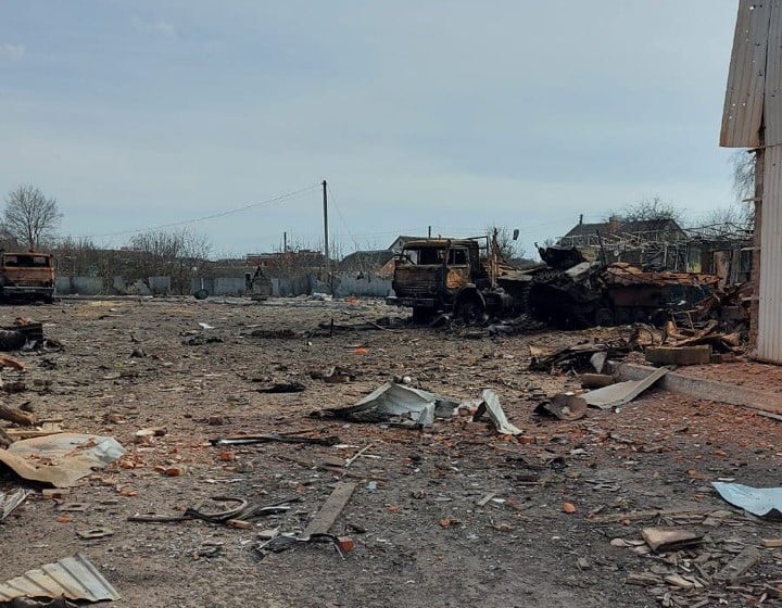 На фото видно знищену САУ “Мста-С”, іншу бронетехніку, вантажні автомобілі.