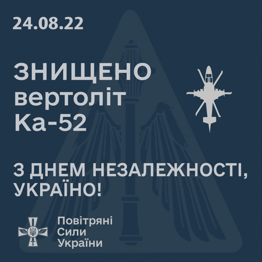 У середу, 24 серпня, Повітряні сили збили російський вертоліт Ка-52 на східному напрямку.