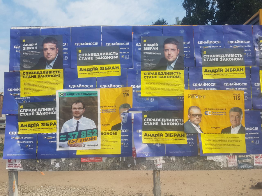 Так, у Києві розміщено рекламу у стилі президентської кампанії Володимира Зеленського, що, відповідно, натякає на партію "Слуга народу" та білборди, що нагадують агітаційну кампанію "Європейської солідарності".