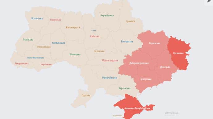 Станом на 21:44 повітряну тривогу оголошено в Дніпропетровській, Харківській, Запорізькій, Донецькій та Луганській областях, а також постійно в окупованому Криму.