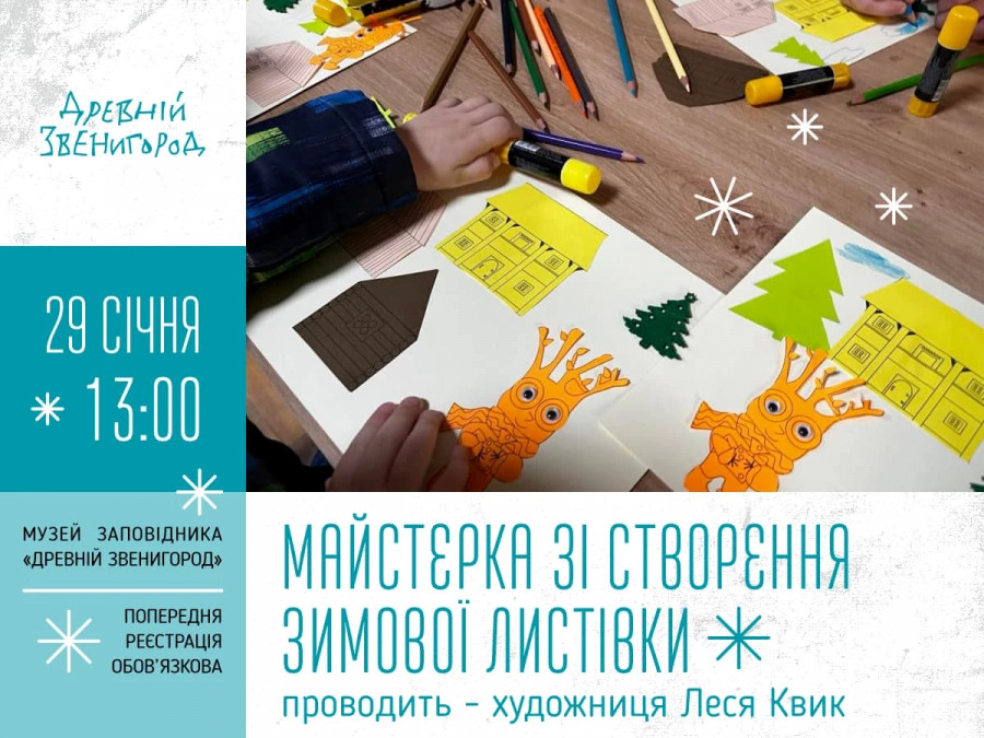 Виготовлення зимової звенигородської листівки розпочнеться о 13.00. Тривалість події 40-50 хвилин. Взяти участь можуть діти від 3 до 10 років.