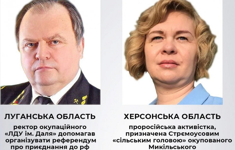 За даними спецслужби, йдеться про ректора окупаційного "Луганського університету ім. Даля", який допомагав росіянам організовувати референдум, та ставленицю Стрємоусова, яка була сільською головою окупованого Микільського на Херсонщині.