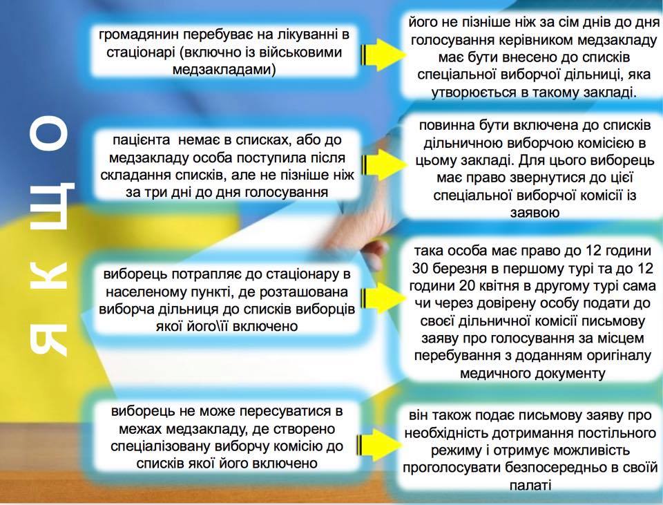 Якщо громадянин перебуває на лікуванні в стаціонарі (включно із військовими медзакладами), його не пізніше ніж за сім днів до дня голосування керівником медзакладу має бути внесено до списків спеціальної виборчої дільниці, яка утворюється в такому закладі. Зі списками необхідно ознайомитись завчасно, для цього варто звернутися до керівника медзакладу. Якщо пацієнта немає в списках, або до медзакладу особа поступила після складання списків, але не пізніше ніж за три дні до дня голосування, повинна бути включена до списків дільничною виборчою комісією в цьому закладі.