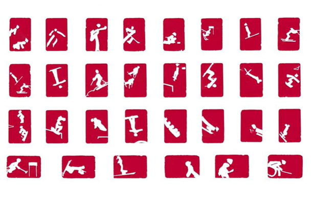 Усі піктограми зроблені у вигляді прямокутників. Стилізовані фігурки спортсменів червоного кольору зображені на білому тлі в червоній окантовці.