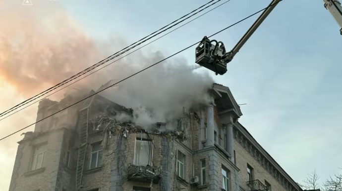 1 січня вранці в Києві уламки ворожого дрона впали на житловий будинок у Печерському районі, частково зруйнувавши два верхні поверхи та спричинивши пожежу. У Святошинському районі горить нежитлова будівля, пошкоджена трамвайна колія. Шестеро людей постраждали.