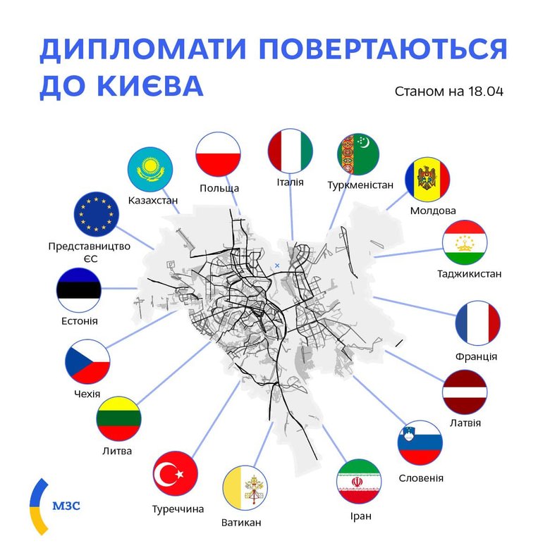 Станом на 18 квітня у Києві знову працюють 15 дипломатичних представництв.