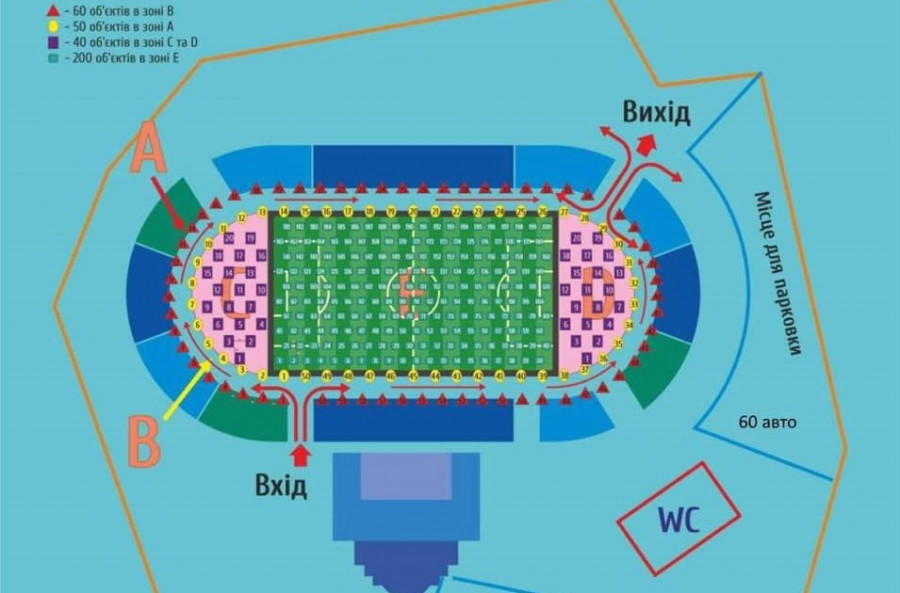 Територія стадіону повністю огороджена, що дає можливість контролю входу та виходу, з дотриманням максимально дозволеної кількості покупців в середині чаши. З розрахунку 20 метрів квадратних на одного покупця та відстані між торговими палатками по три метри по вертикалі та горизонталі, на стадіоні може знаходитися одночасно 350 торгових палаток, 500 покупців та 250 місць для парковки авто за межами.
