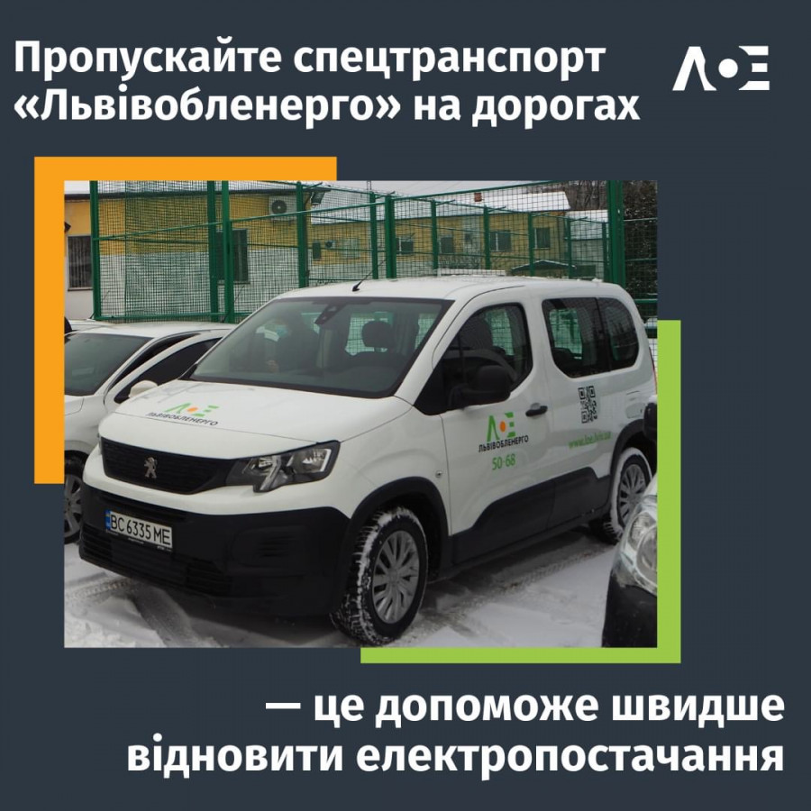 "Львівобленерго" просить пропускати їхній спецтранспорт на дорогах міста й області. У компанії пояснюють, що термін включення під час планових (погодинних) вимкнень може збільшуватись, зважаючи на час доїзду оперативних бригад до енергооб’єктів для проведення перемикань.