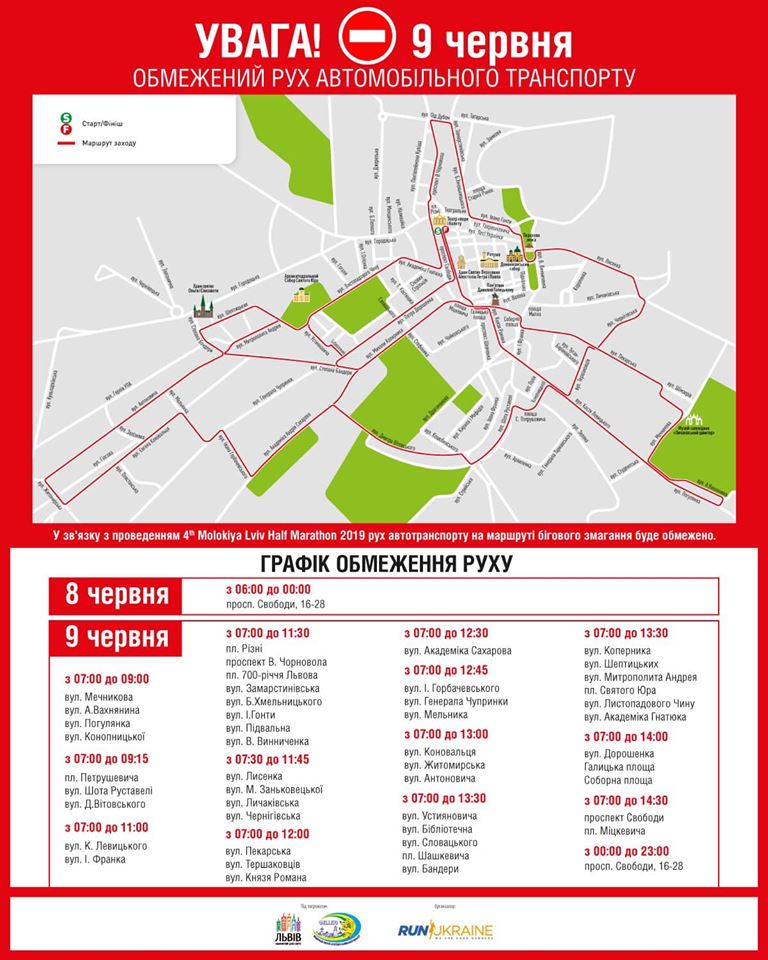 Організатор Львівського півмарафону, компанія Run Ukraine, просить водіїв планувати завчасно своє пересування по місту альтернативним маршрутом, враховуючи графік перекриття.