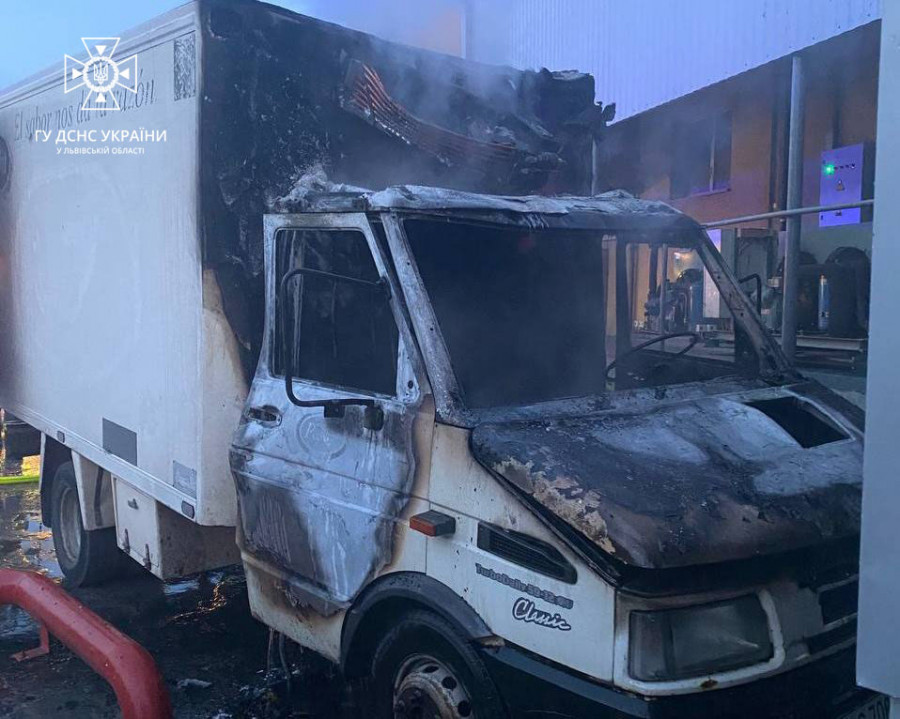 Вогнем знищено кабіну водія та моторний відсік. Також пошкоджено кузов автомобіля та ворота складської будівлі.