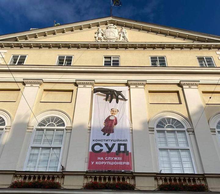 Сьогодні, 30 жовтня, вранці, у Львові на Ратуші вивісили банер з карикатурою на суддів КСУ