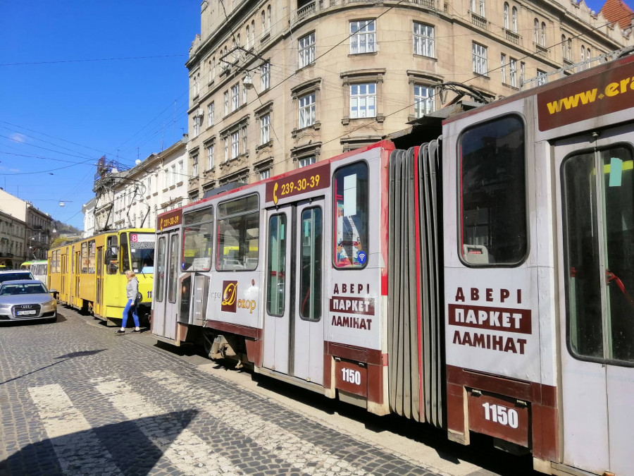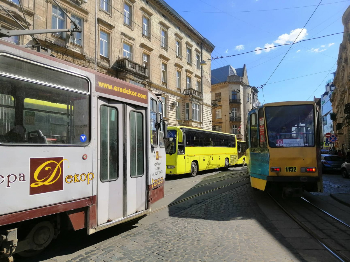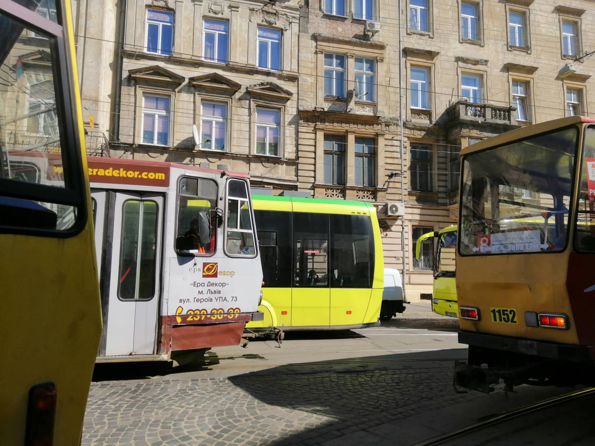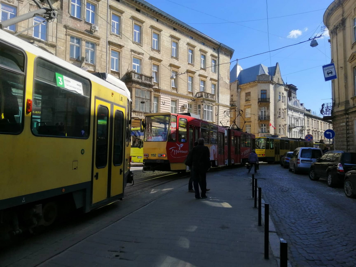 У цю мить у Львові на площі Соборній зупинився рух транспорту, його паралізували трамваї, які виїжджають із площі.