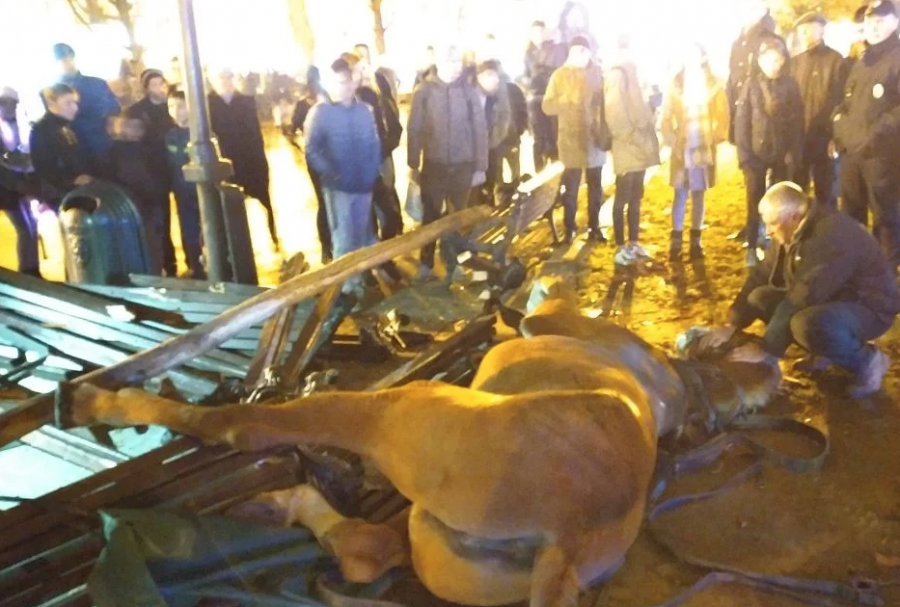 Зазнав травми кінь. Він лежав поміж уламків лавки, у нього кровоточила нога. Працівники ДСНС розрізали лавку, очікують ветеринара.