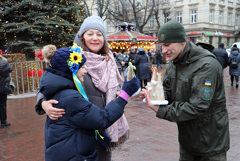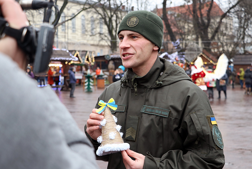 Гвардійці власноруч створили святкові ялинки з картону, декоративних ниток та блакитно-жовтих стрічок, які дарували перехожим разом з вітальними листівками і бажали гарних новорічних свят містянам.