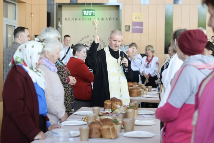 Святковий сніданок організували управління соціального захисту Львівської мерії спільно з Українським католицьким університетом. Гості куштували традиційні страви українського великоднього столу: паску, яєчка, сир, масло, м’ясні наїдки, тушковану капусту з м’ясом, салат, бурячки з хроном, солодощі та узвар. Передували сніданку спільна молитва та освячення пасок.