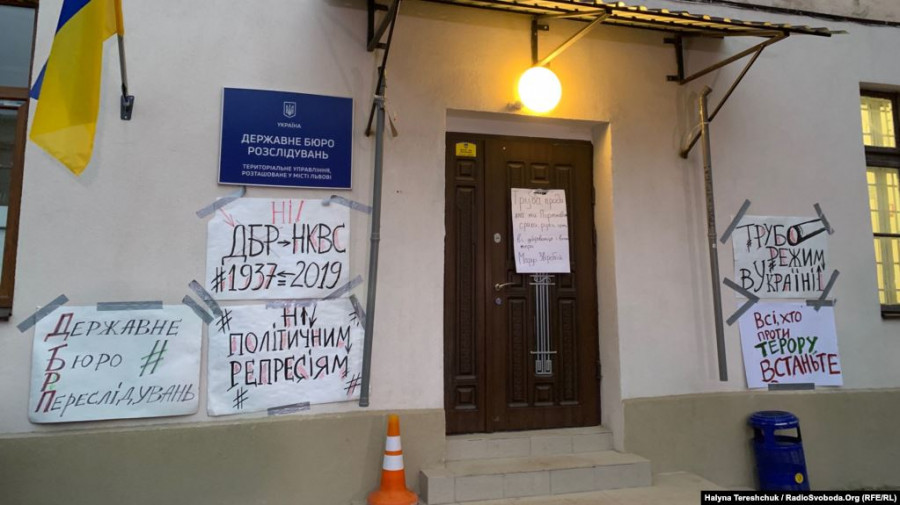 Як передає кореспондент Радіо Свобода, плакати зі словами – «Ні політичним репресіям», «Ні ДБР – НКВД», «Державне бюро переслідувань» та інші вивісили при вході у будівлю ДБР у Львові.