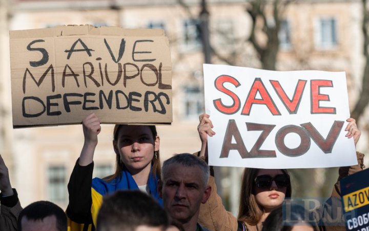 Учасники акції тримали плакати з закликами звільнити полонених та надписами “Територіальна оборона Маріуполя”, “Save Mariupol Defenders”, “АЗОВ-ГЕРОЇ”.