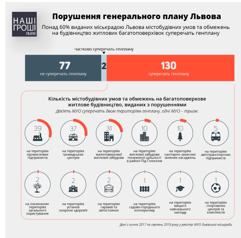 Журналісти видання проаналізували усі містобудівні умови та обмеження, видані на будівництво житлових багатоповерхівок у Львові з липня 2017 до серпня 2019 року. Загалом з 209 МУО генеральному плану міста суперечить 130 МУО, ще два – суперечать йому частково. З детальним переліком можна ознайомитись у розділі «Документи».