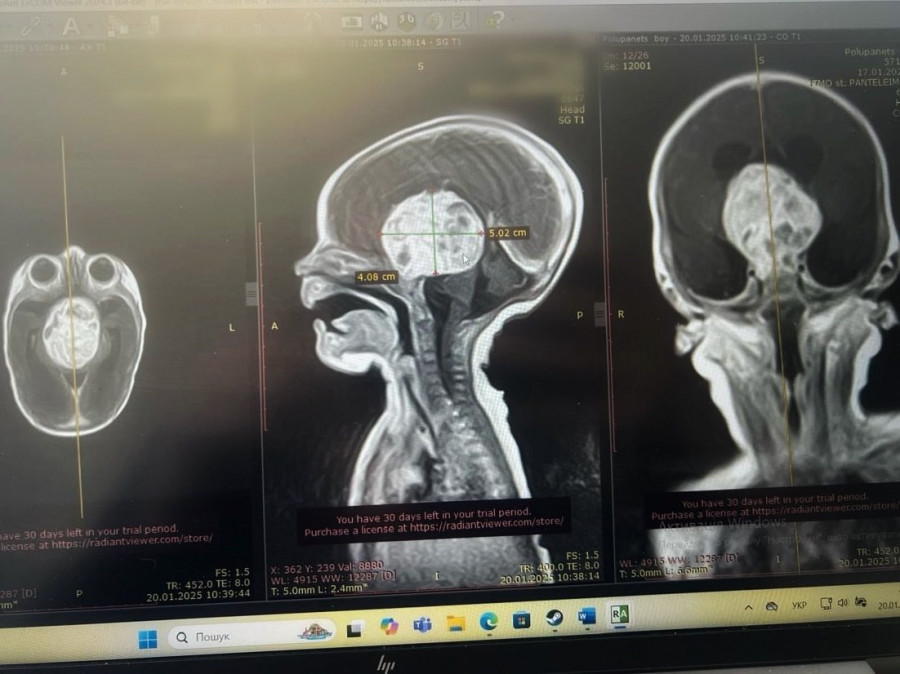 Гістологічне дослідження показало, що у хлопчика була краніофарингіома — рідкісна доброякісна пухлина, яка трапляється лише у близько 6% дітей із пухлинами мозку. Через два тижні після операції дитині встановили лікворо-шунтуючу систему, яка регулює відтік спинномозкової рідини та запобігає набряку мозку.