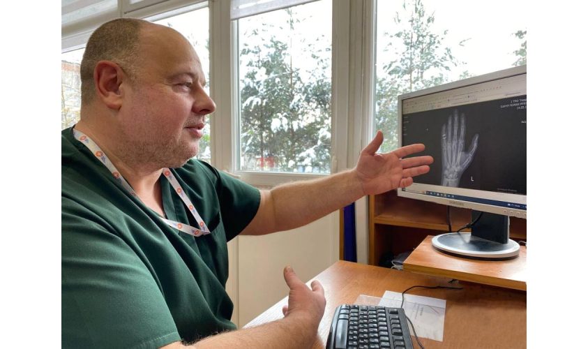 Захиснику – 45 років, він зі Львова. До лікарів звернувся через постійний та сильний біль лівої руки. Мізинець набрякав, зігнути чи розігнути його чоловік уже не міг. Все – через контрактуру Дюпюїтрена – патологію долонної сполучної тканини, яка зумовила рубцеві зміни суглоба. Погіршила стан також отримана раніше травма пальця. Усе разом призвело до деформації фаланги. Як наслідок – рука нестерпно боліла навіть при найменших рухах пальцями. Суглоб знерухомився і почав руйнуватися.