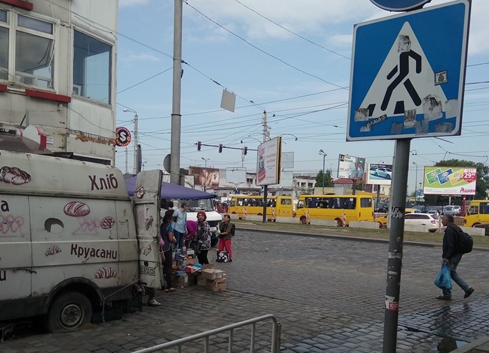 У Львові на розі Привокзального ринку, просто на дорозі, за крок до пішохідного переходу, просто з буса торгують хлібобулочними виробами. Ні патрульна поліція, ні звичайна начебто не можуть нічого з тим вдіяти.