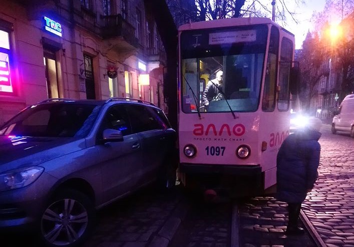 У Львові зійшов із рейок трамвай і вперся в Мерседес: власник-іноземець у шоці