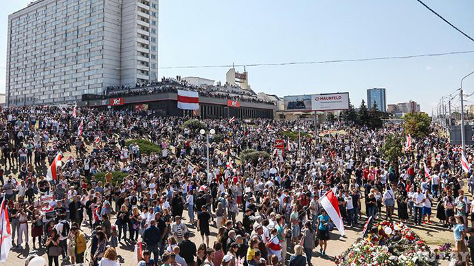 Люди тримають прапори Білорусі і квіти, деякі – плакати зі знімками побитих в ході акцій протесту.