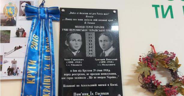 Зокрема, поклали квіти до пам'ятної таблиці учням Перемиської гімназії, героям Крут - Івану Сорокевичу та Григорію Пипському, що розміщена на приміщенні головного корпусу комплексу загальноосвітньої школи № 2 ім. Маркіяна Шашкевича в м. Перемишлі Республіки Польща.