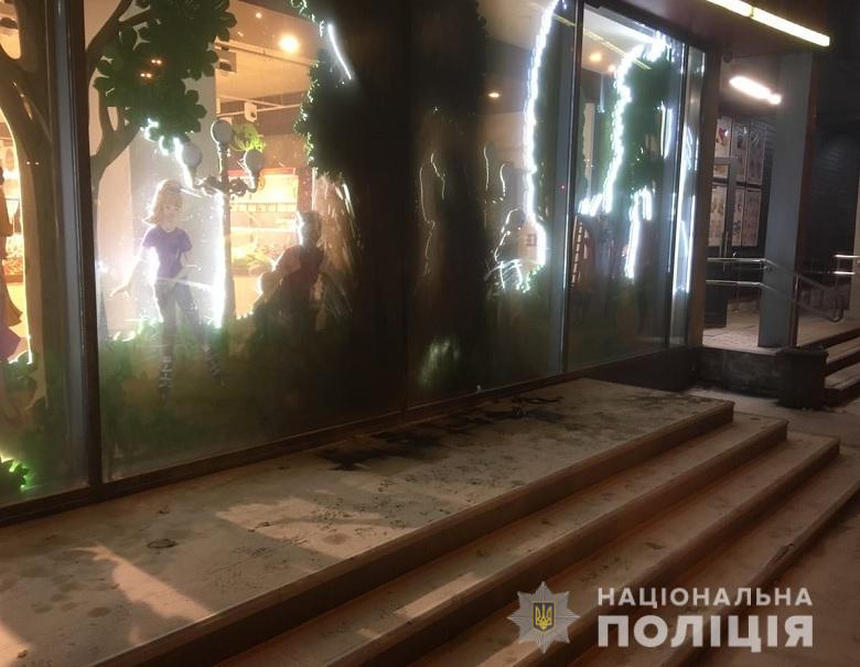 У повідомлення сказано, що працівники поліції опитали свідків, які повідомили, що до магазину підбігли двоє осіб у медичних масках, облили вітрину невідомою речовиною та підпалили. Після чого, з місця злочину втекли.