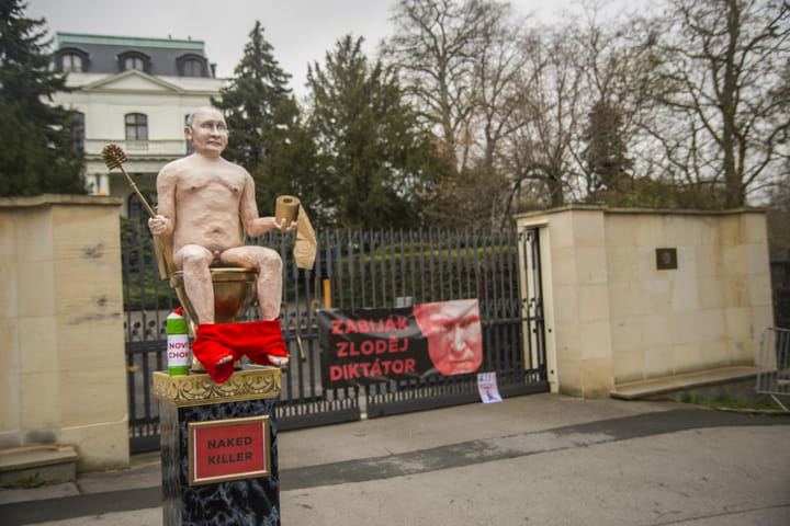 Група активістів принесла до будівлі посольства Російської Федерації в Празі фігуру голого президента РФ Владіміра Путіна на золотому унітазі.