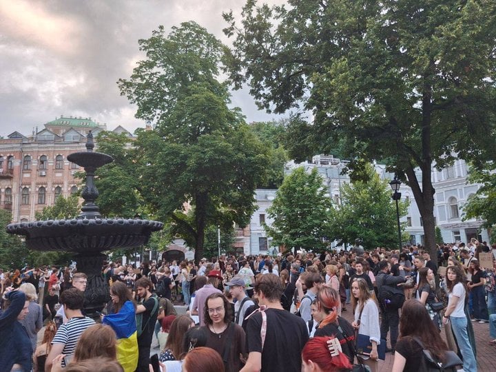 У вівторок, 22 липня, у центрі Києва протестувальники вийшли на мітинг проти підписання законопроєкту про фактичну ліквідацію незалежності НАБУ та САП. Законопроєкт ухвалили депутати Верховної Ради, наразі його передали на підпис президенту України Володимиру Зеленському.