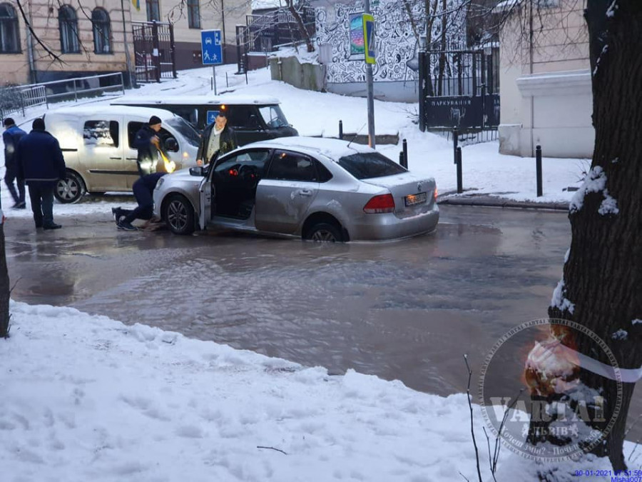 Подія сталася на вул. Стефаника перед перехрестям з вул. Чайковского. Внаслідок прориву води, утворилася яма, в яку провалилося авто.