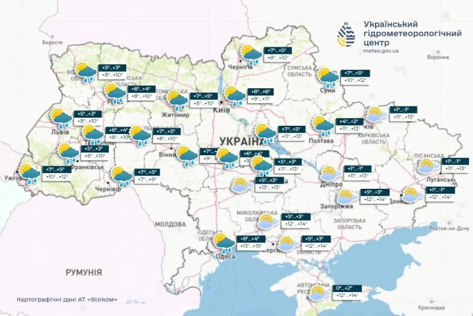 На високогір'ї Карпат мокрий сніг та дощ; температура протягом доби 0-5° тепла.