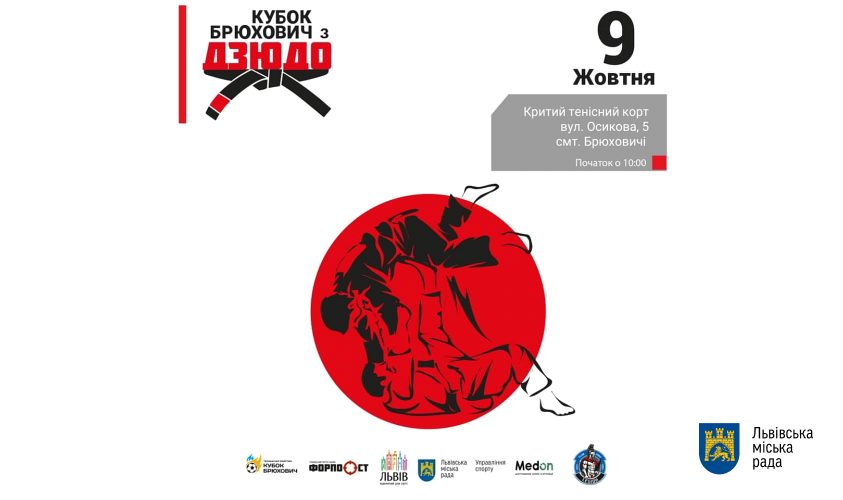 У суботу, 9 жовтня, на критому тенісному корті (вул. Осикова, 5, Брюховичі) відбудеться Кубок Брюхович з дзюдо. Участь у змаганнях візьмуть юні дзюдоїсти, які змагатимуться у трьох вікових категоріях: 2007-2009, 2010-2012 та 2013-2015 роки народження.